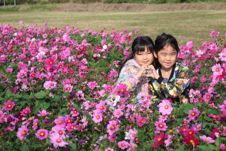 子どもたちは、コスモス畑の間にできた小道を歩いたり、