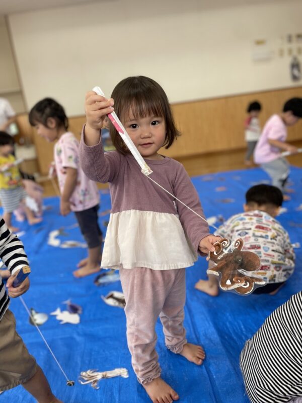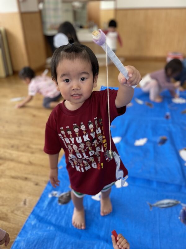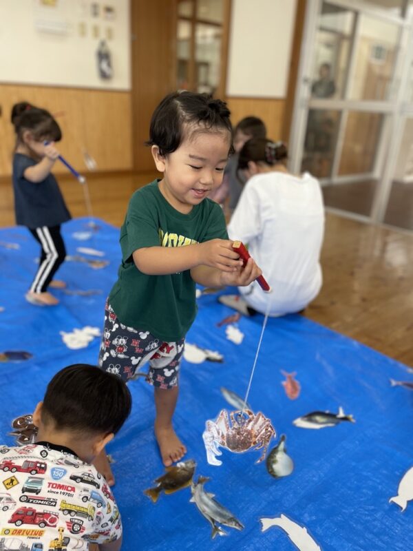 子どもたちは魚釣り遊びに挑戦しました。