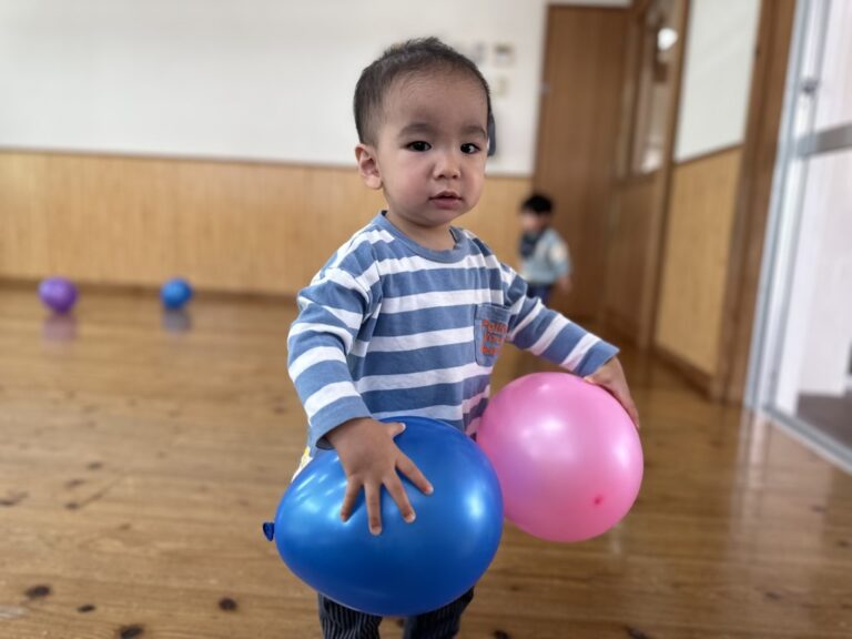 0歳児の子どもたちが風船遊びを楽しんでいました。
